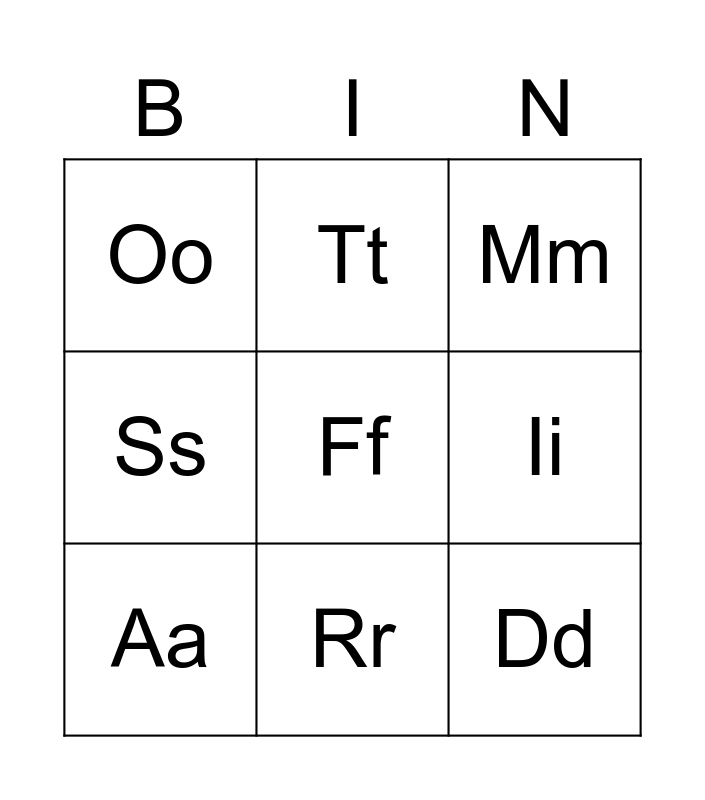 This bingo card has 9 words: Aa, Mm, Tt, Ss, Oo, Ii, Ff, Dd and Rr.