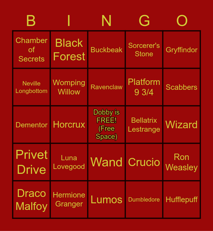 This bingo card has a free space and 59 words: Harry Potter, Hermione Granger, Hogwarts Express, Privet Drive, Dumbledore, Prizoner of Azkaban, Womping Willow, Golden Snitch, Platform 9 3/4, Gringotts, Sorcerer's Stone, Ollivander, Neville Longbottom, Wingardium Leviosa, Dudley Dursley, Chamber of Secrets, Hufflepuff, Gryffindor, Slytherin, Ravenclaw, Bellatrix Lestrange, Buckbeak, Draco Malfoy, Ron Weasley, Professor Snape, Hogwarts, Mandrake, Order of the Phoenix, Scabbers, Marauder's Map, Muggle, Quidditch, Butterbeer, Bludgers, Black Forest, Hogsmeade, Chocolate Frogs, Horcrux, Expecto Patronum, Dementor, Herbology, Luna Lovegood, Wizard, Norbert, Diagon Alley, Floo Powder, Nearly Headless Nick, Sirius Black, Wand, Lumos, Half Blood Prince, Tom Riddle, Basilisk, Hedwig, Expelliarmus, Crucio, Avada Kedavra, Potions and Defense against the Dark Arts.