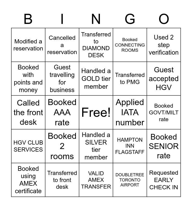 This bingo card has a free space and 24 words: Booked 2 rooms, Transferred to front desk, Handled a GOLD tier member, Booked using AMEX certificate, Used 2 step verification, Modified a reservation, Booked with points and money, Cancelled a reservation, Applied IATA number, Handled a SILVER tier member, Transferred to PMG, Called the front desk, HAMPTON INN FLAGSTAFF, Booked SENIOR rate, Guest travelling for business, DOUBLETREE TORONTO AIRPORT, Booked GOVT/MILT rate, Transferred to DIAMOND DESK, Guest accepted HGV, Booked AAA rate, Requested EARLY CHECK IN, HGV CLUB SERVICES, Booked CONNECTING ROOMS and VALID AMEX TRANSFER.