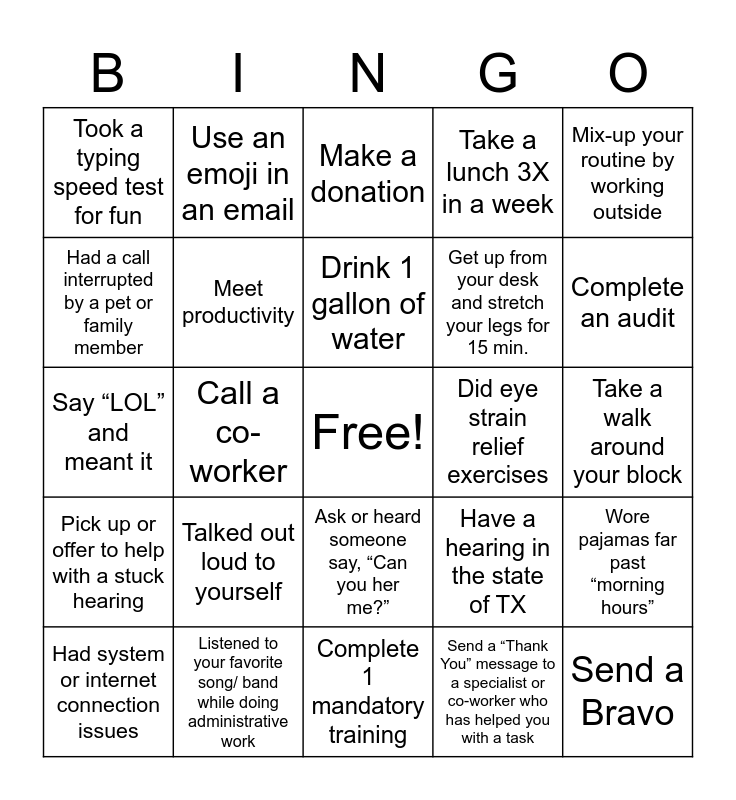 This bingo card has a free space and 24 words: Talked out loud to yourself, Listened to your favorite song/ band while doing administrative work, Drink 1 gallon of water, Had system or internet connection issues, Mix-up your routine by working outside, Took a typing speed test for fun, Had a call interrupted by a pet or family member, Use an emoji in an email, Did eye strain relief exercises, Ask or heard someone say, “Can you her me?”, Get up from your desk and stretch your legs for 15 min., Say “LOL” and meant it, Have a hearing in the state of TX, Wore pajamas far past “morning hours”, Meet productivity, Send a “Thank You” message to a specialist or co-worker who has helped you with a task, Take a walk around your block, Make a donation, Complete an audit, Call a co-worker, Send a Bravo, Pick up or offer to help with a stuck hearing, Take a lunch 3X in a week and Complete 1 mandatory training.