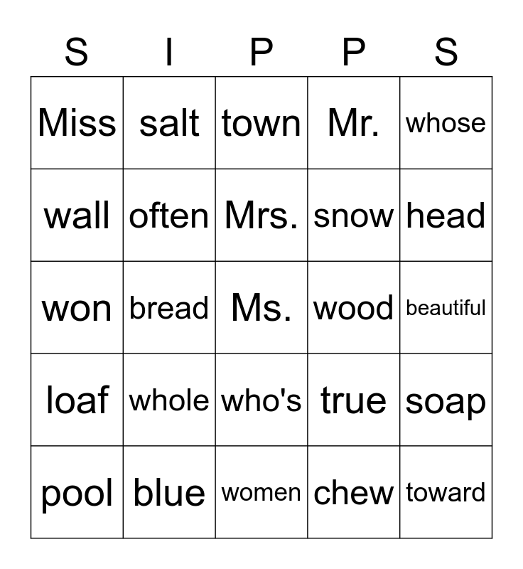 This bingo card has 28 words: soap, cook, snow, chew, wall, town, salt, loaf, wood, pool, won, Mr., blue, women, head, woman, whole, often, Mrs., who's, Miss, toward, Ms., bread, beautiful, true, whose and only.