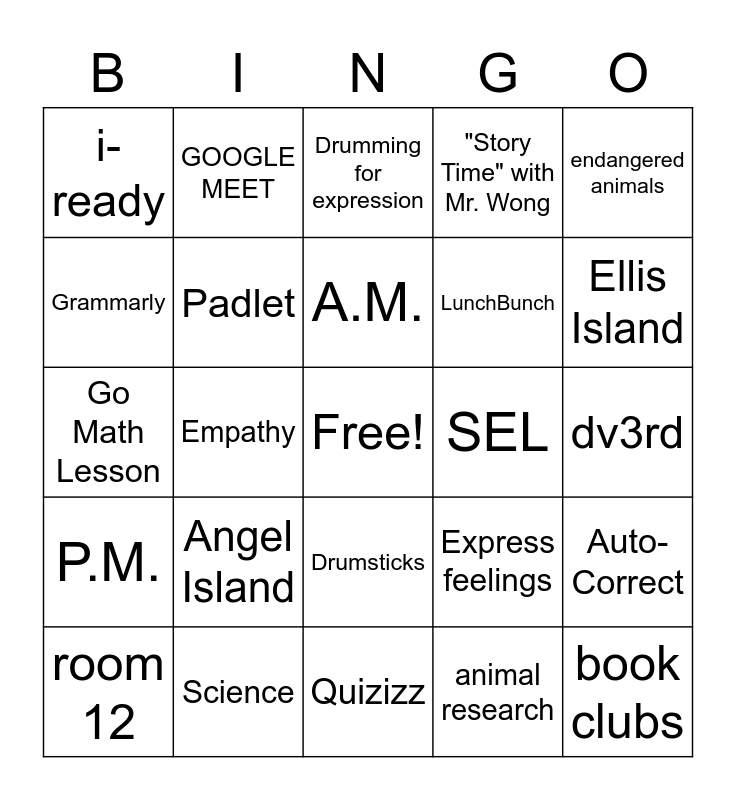 This bingo card has a free space and 42 words: 3rd Grade, A.M., agenda, Angel Island, animal research, Auto-Correct, book clubs, Clever, Drumming for expression, Drumsticks, dv3rd, Ellis Island, Empathy, endangered animals, EPIC BOOKS, Express feelings, fairy tale, Go Math Lesson, Google Classroom, GOOGLE MEET, Grammarly, GROUP A, GROUP B, i-ready, Immigration, Hybrid students, LunchBunch, math, Mr.Wong, Mrs. Howard, NEW Book Clubs, P.M., Padlet, Quizizz, Reader's Workshop, room 12, Science, SEL, social studies, SPACE, "Story Time" with Mr. Wong and Writer's Workshop.