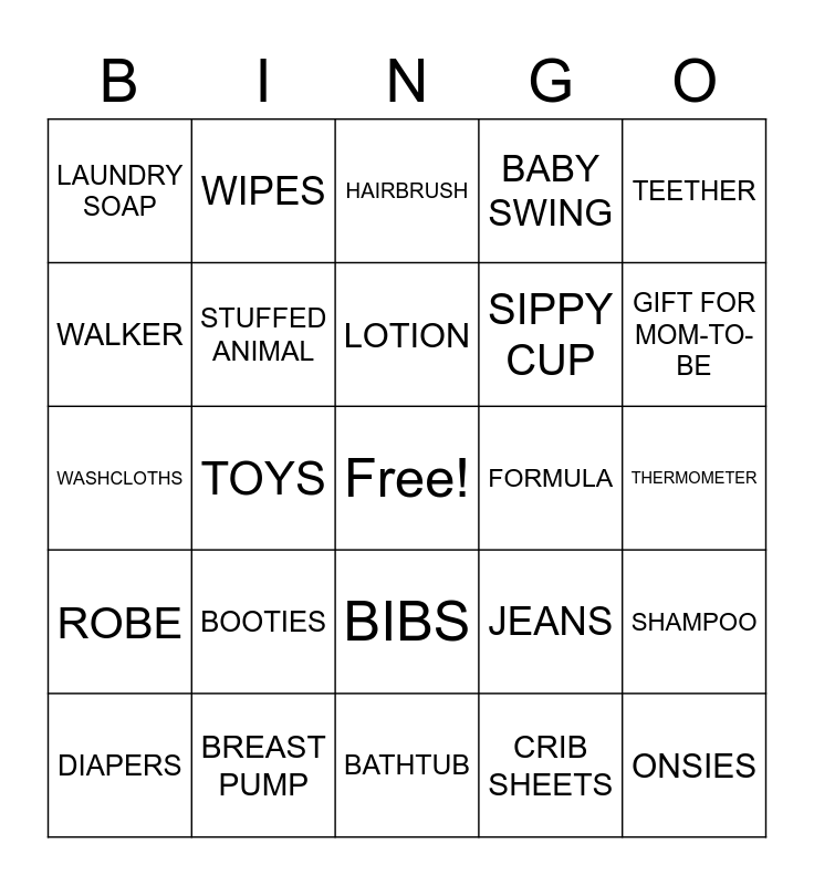 This bingo card has a free space and 25 words: BOOTIES, BATHTUB, LOTION, DIAPERS, TEETHER, LAUNDRY SOAP, WALKER, WIPES, FORMULA, BIBS, SIPPY CUP, WASHCLOTHS, JEANS, SHAMPOO, STUFFED ANIMAL, SOUND MACHINE, THERMOMETER, HAIRBRUSH, GIFT FOR MOM-TO-BE, TOYS, ONSIES, BREAST PUMP, ROBE, BABY SWING and CRIB SHEETS.