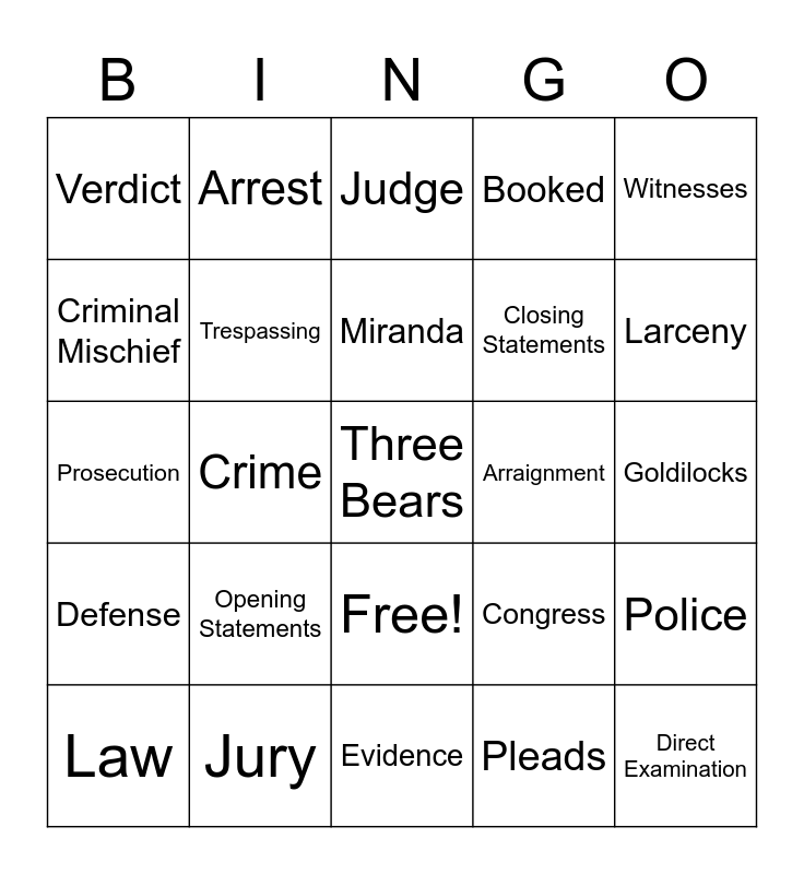This bingo card has 26 words: Free!, Pleads, Miranda, Jury, Witnesses, Verdict, Criminal Mischief, Arrest, Goldilocks, Congress, Closing Statements, Prosecution, Police, Law, Crime, Free, Booked, Defense, Judge, Three Bears, Larceny, Evidence, Arraignment, Opening Statements, Trespassing and Direct Examination.