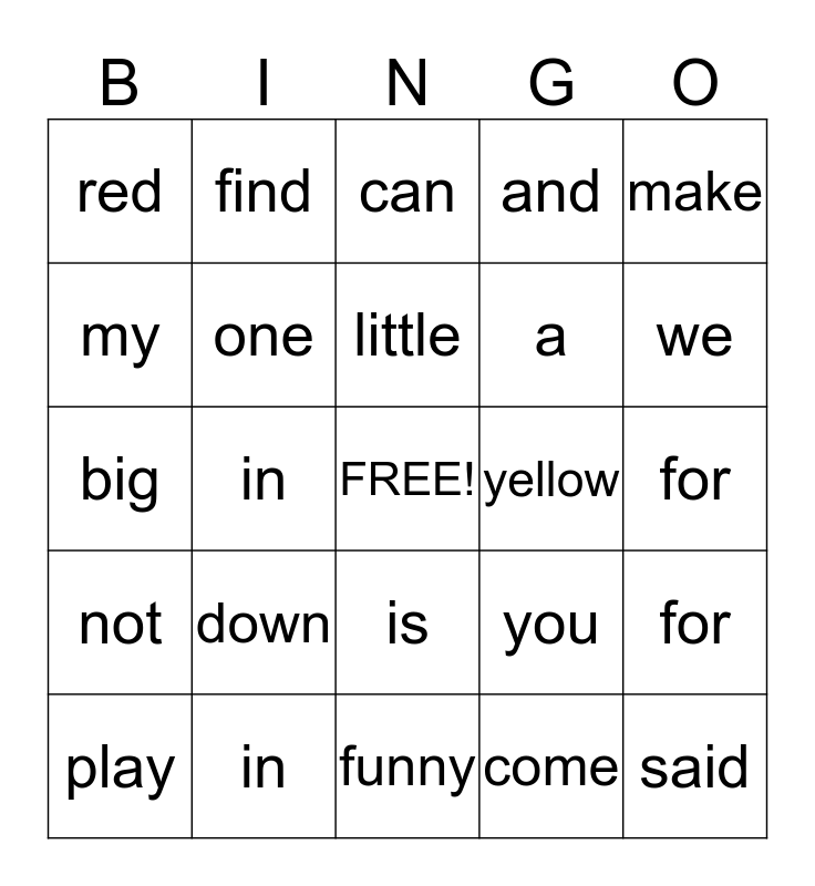 This bingo card has a free space and 24 words: down, in, little, play, make, red, my, find, yellow, is, a, big, you, for, one, come, for, can, we, in, said, not, and and funny.