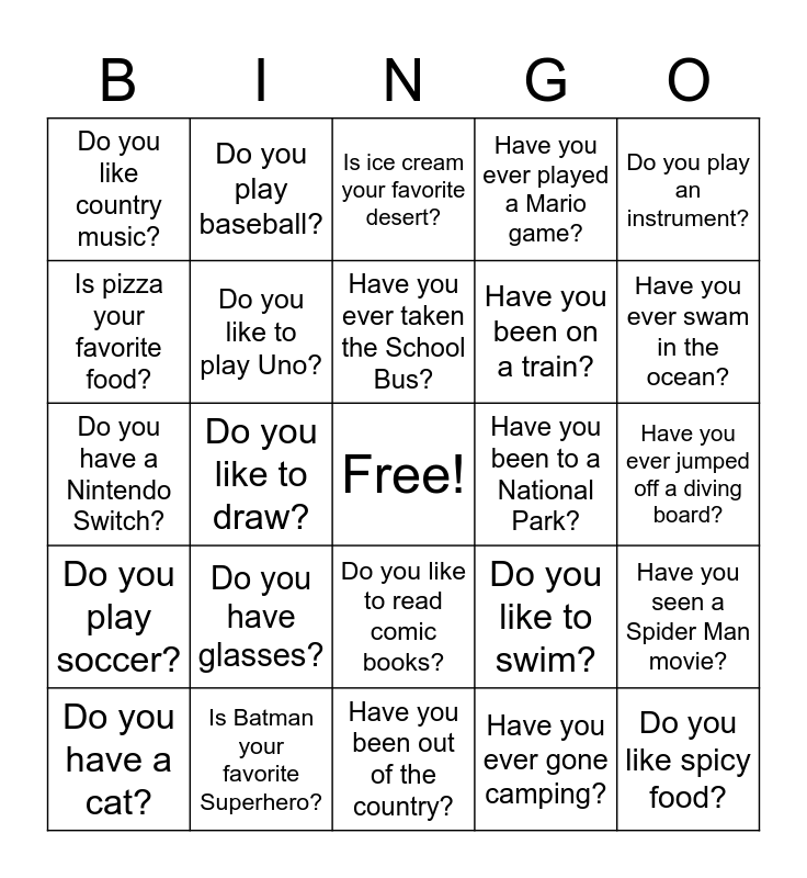 This bingo card has a free space and 27 words: Do you like to swim?, Do you have a dog?, Have you been on a train?, Have you been out of the country?, Is pizza your favorite food?, Is ice cream your favorite desert?, Do you play baseball?, Do you play soccer?, Have you been to a National Park?, Have you seen a Spider Man movie?, Do you have a Nintendo Switch?, Have you ever played a Mario game?, Do you have a cat?, Is Batman your favorite Superhero?, Have you ever swam in the ocean?, Is your favorite game cuphead?, Do you like to play Uno?, Have you ever taken the School Bus?, Do you have glasses?, Do you like country music?, Have you ever jumped off a diving board?, Have you ever gone camping?, Do you like to draw?, Do you like spicy food?, Do you like to read comic books?, Do you play an instrument? and Have you ever broken a bone?.