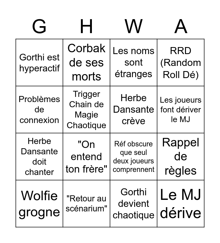 This bingo card has 18 words: "On entend ton frère", Le MJ dérive, Les noms sont étranges, Gorthi est hyperactif, Réf obscure que seul deux joueurs comprennent, RRD (Random Roll Dé), Wolfie grogne, Corbak de ses morts, Les joueurs font dériver le MJ, Herbe Dansante doit chanter, Gorthi devient chaotique, Problèmes de connexion, Rappel de règles, Trigger Chain de Magie Chaotique, Herbe Dansante crève, Wolfie ne prends pas part au débat, "Retour au scénarium" and Herbe Dansante fait une connerie.