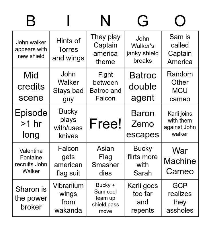 This bingo card has a free space and 24 words: Falcon gets american flag suit, Vibranium wings from wakanda, Fight between Batroc and Falcon, Sharon is the power broker, Sam is called Captain America, John walker appears with new shield, Mid credits scene, Hints of Torres and wings, Baron Zemo escapes, Asian Flag Smasher dies, Batroc double agent, Episode >1 hr long, Bucky flirts more with Sarah, War Machine Cameo, John Walker Stays bad guy, Karli goes too far and repents, Karli joins with them against John walker, They play Captain america theme, Random Other MCU cameo, Bucky plays with/uses knives, GCP realizes they assholes, Valentina Fontaine recruits John Walker, John Walker's janky shield breaks and Bucky + Sam cool team up shield pass move.