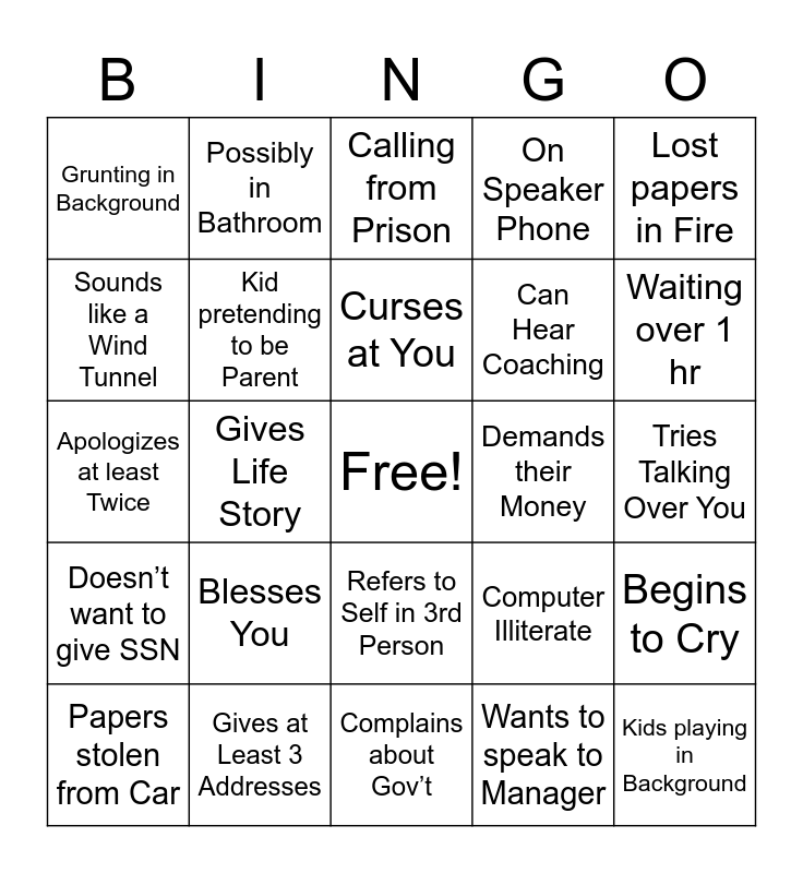 This bingo card has a free space and 24 words: Blesses You, Gives at Least 3 Addresses, Curses at You, Papers stolen from Car, Lost papers in Fire, Grunting in Background, Sounds like a Wind Tunnel, Possibly in Bathroom, Demands their Money, Refers to Self in 3rd Person, Can Hear Coaching, Apologizes at least Twice, Computer Illiterate, Begins to Cry, Kid pretending to be Parent, Wants to speak to Manager, Tries Talking Over You, Calling from Prison, Waiting over 1 hr, Gives Life Story, Kids playing in Background, Doesn’t want to give SSN, On Speaker Phone and Complains about Gov’t.