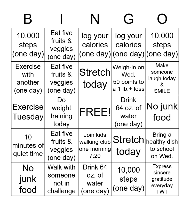 This bingo card has a free space and 24 words: Eat five fruits & veggies (one day), Walk with someone not in challenge, Stretch today, No junk food, 10,000 steps (one day), 10,000 steps (one day), Exercise with another (one day), Eat five fruits & veggies (one day), Drink 64 oz. of water (one day), Join kids walking club one morning 7:20, Weigh-in on Wed. 50 points to a 1 lb.+ loss, Exercise Tuesday, Stretch today, Bring a healthy dish to school on Wed., Eat five fruits & veggies (one day), 10,000 steps (one day), No junk food, log your calories (one day), Make someone laugh today & SMILE, Do weight training today, Express sincere gratitude everyday TWT, 10 minutes of quiet time, log your calories (one day) and Drink 64 oz. of water (one day).