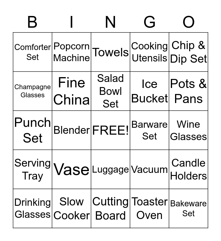 This bingo card has a free space and 24 words: Vase, Slow Cooker, Salad Bowl Set, Drinking Glasses, Chip & Dip Set, Comforter Set, Champagne Glasses, Popcorn Machine, Barware Set, Luggage, Ice Bucket, Punch Set, Vacuum, Candle Holders, Fine China, Toaster Oven, Wine Glasses, Towels, Pots & Pans, Blender, Bakeware Set, Serving Tray, Cooking Utensils and Cutting Board.