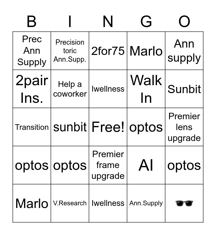 This bingo card has a free space and 24 words: optos, V.Research, Iwellness, Marlo, Ann supply, Prec Ann Supply, 2pair Ins., Precision toric Ann.Supp., optos, Premier frame upgrade, Walk In, Transition, AI, optos, Help a coworker, Ann.Supply, Premier lens upgrade, 2for75, Sunbit, sunbit, 🕶, optos, Marlo and Iwellness.