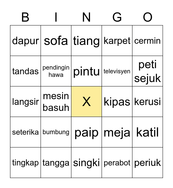 This bingo card has a free space and 24 words: bumbung, tangga, pintu, tingkap, cermin, dapur, tandas, sofa, kipas, paip, televisyen, langsir, meja, katil, pendingin hawa, perabot, kerusi, tiang, peti sejuk, mesin basuh, periuk, seterika, karpet and singki.