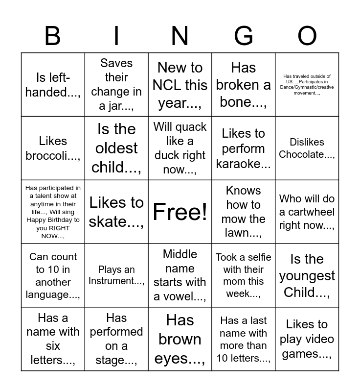 This bingo card has a free space and 37 words: Was born in Texas...,, Was born outside of Texas...,, Does their own laundry...,, Is the oldest child...,, Is the youngest Child...,, Plays an Instrument...,, Will quack like a duck right now...,, Has a pet that does not have 4 legs...,, Has traveled outside of US..., Participates in Dance/Gymnastic/creative movement...,, Plays a sport with a ball...,, Likes to skate...,, Has broken a bone...,, Likes to play video games...,, Who will do a cartwheel right now...,, Likes broccoli...,, Can count to 10 in another language...,, Has a birthday this month...,, New to NCL this year...,, Middle name starts with a vowel...,, Knows how to mow the lawn...,, Is left-handed...,, Dislikes Chocolate...,, Has a name with six letters...,, Has brown eyes...,, Has already started to learn to drive...,, Has a last name with more than 10 letters...,, Saves their change in a jar...,, Can tell you a funny joke right now...,, Has washed their clothes in a laundromat before...,, Who has a birthday month and date that adds up to a double digit number...,, Who has a birthday month and date that add up to a single digit number...,, Has performed on a stage...,, Has participated in a talent show at anytime in their life..., Will sing Happy Birthday to you RIGHT NOW...,, Will do the chicken dance right now...,, Took a selfie with their mom this week...,, Likes to perform karaoke... and Flosses their teeth every day.....