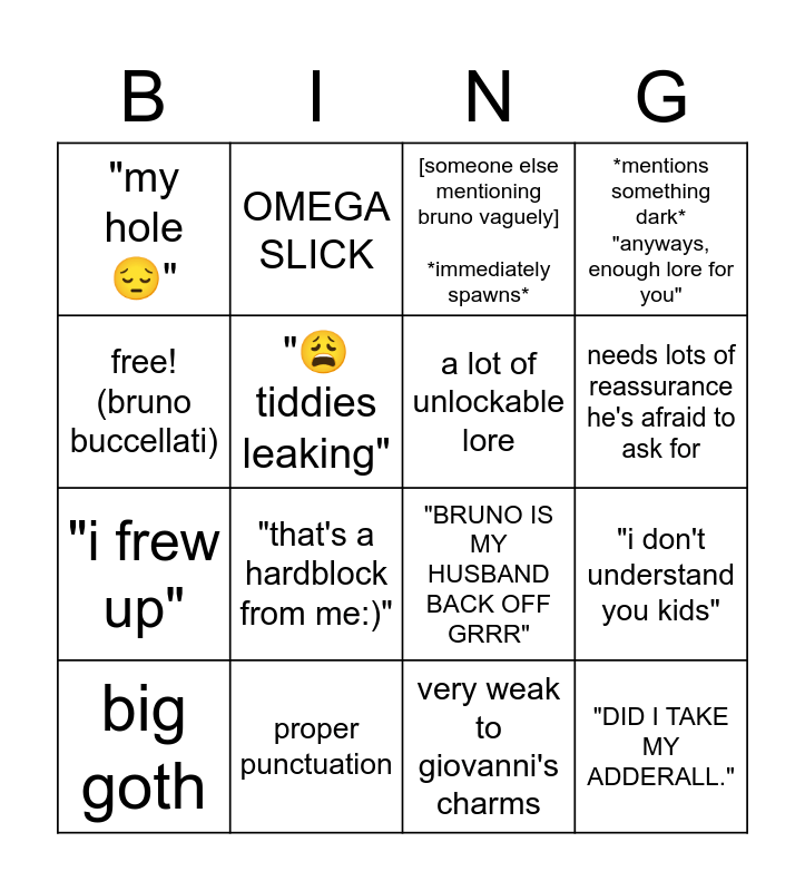 This bingo card has 16 words: proper punctuation, "i don't understand you kids", [someone else mentioning bruno vaguely] *immediately spawns*, "my hole😔", "i frew up", OMEGA SLICK, "BRUNO IS MY HUSBAND BACK OFF GRRR", very weak to giovanni's charms, free! (bruno buccellati), "😩tiddies leaking", big goth, *mentions something dark* "anyways, enough lore for you", "that's a hardblock from me:)", needs lots of reassurance he's afraid to ask for, a lot of unlockable lore and "DID I TAKE MY ADDERALL.".