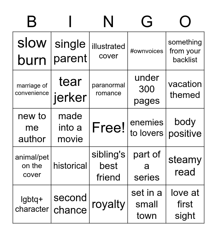 This bingo card has a free space and 24 words: lgbtq+ character, historical, paranormal romance, set in a small town, something from your backlist, slow burn, single parent, illustrated cover, enemies to lovers, body positive, new to me author, tear jerker, part of a series, steamy read, marriage of convenience, second chance, royalty, #ownvoices, vacation themed, animal/pet on the cover, made into a movie, sibling's best friend, under 300 pages and love at first sight.