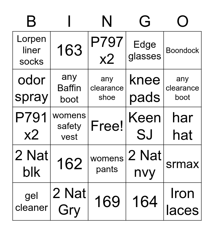 This bingo card has a free space and 24 words: 162, 2 Nat Gry, any clearance shoe, gel cleaner, Boondock, Lorpen liner socks, odor spray, 163, Keen SJ, womens pants, knee pads, P791 x2, 2 Nat nvy, srmax, any Baffin boot, 164, har hat, P797 x2, any clearance boot, womens safety vest, Iron laces, 2 Nat blk, Edge glasses and 169.