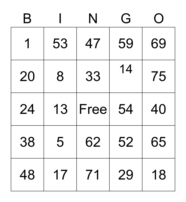 This bingo card has a free space and 24 words: 5, 17, 33, 48, 69, 1, 20, 53, 54, 62, 14, 24, 52, 65, 8, 29, 40, 47, 75, 13, 18, 38, 59 and 71.