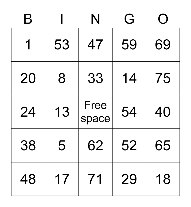 This bingo card has a free space and 24 words: 5, 17, 33, 48, 69, 1, 20, 53, 54, 62, 14, 24, 52, 65, 8, 29, 40, 47, 75, 13, 18, 38, 59 and 71.