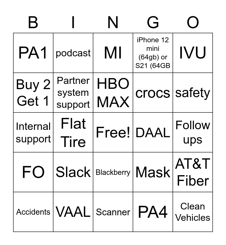 This bingo card has a free space and 30 words: VAAL, Full Bin Review, Flat Tire, FOB, PA1, MI, Partner system support, Blackberry, DAAL, Scanner, Follow ups, Clean Vehicles, PA4, Trust and safety support, safety, Variance, Mask, FO, Slack, IVU, Internal support, traffic, podcast, crocs, Buy 2 Get 1, iPhone 12 mini (64gb) or S21 (64GB, AT&T Fiber, Accidents, HBO MAX and AT&T TV.