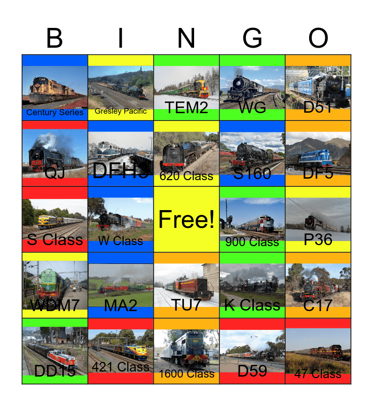 This bingo card has 24 images, a free space and 24 words: MA2, 421 Class, 620 Class, DD15, D51, Century Series, QJ, Gresley Pacific, 900 Class, TU7, S160, S Class, K Class, C17, DFH3, D59, P36, TEM2, DF5, W Class, 47 Class, WDM7, WG and 1600 Class.