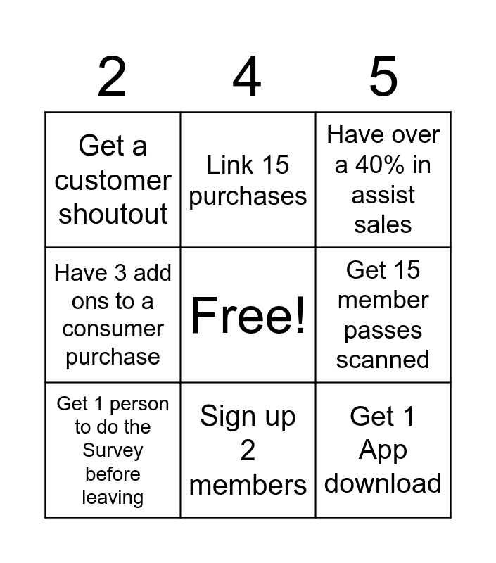 This bingo card has a free space and 8 words: Get 15 member passes scanned, Have over a 40% in assist sales, Link 15 purchases, Get 1 person to do the Survey before leaving, Get a customer shoutout, Get 1 App download, Have 3 add ons to a consumer purchase and Sign up 2 members.
