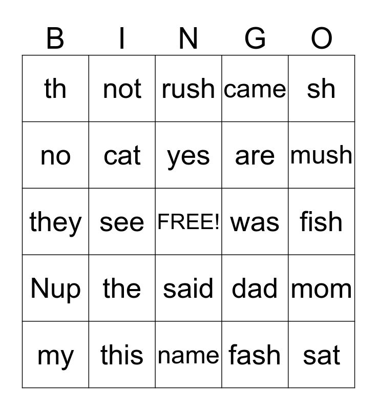 This bingo card has a free space and 24 words: the, this, yes, my, sh, th, no, not, was, said, are, they, dad, mom, cat, fash, fish, rush, mush, see, sat, Nup, came and name.