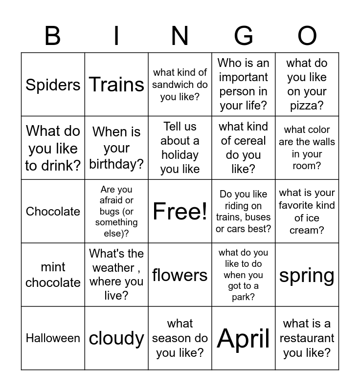 This bingo card has a free space and 24 words: What's the weather , where you live?, cloudy, Tell us about a holiday you like, Halloween, what do you like on your pizza?, Spiders, What do you like to drink?, Trains, Do you like riding on trains, buses or cars best?, flowers, what kind of cereal do you like?, Chocolate, what do you like to do when you got to a park?, spring, When is your birthday?, April, what is your favorite kind of ice cream?, what kind of sandwich do you like?, what color are the walls in your room?, Are you afraid or bugs (or something else)?, what is a restaurant you like?, mint chocolate, Who is an important person in your life? and what season do you like?.