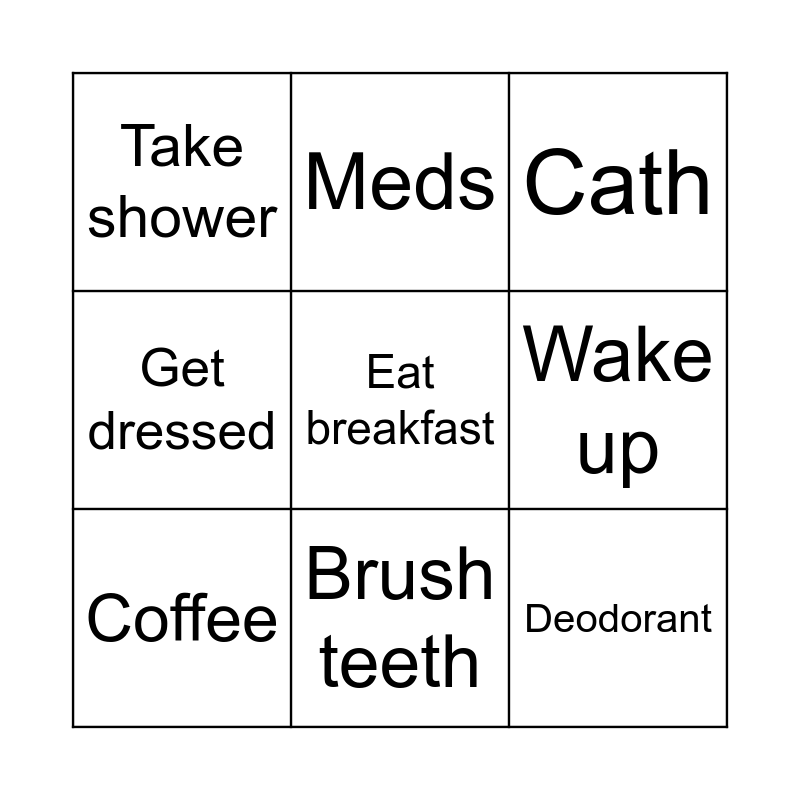 This bingo card has a free space and 8 words: Wake up, Cath, Meds, Coffee, Take shower, Deodorant, Get dressed and Brush teeth.