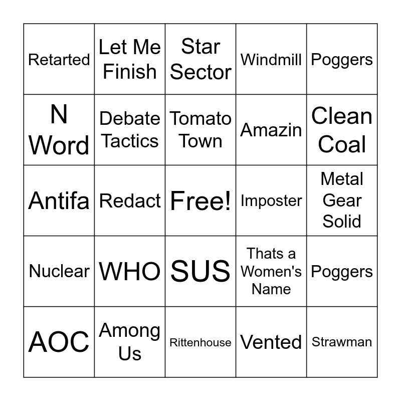 This bingo card has a free space and 24 words: WHO, Among Us, Tomato Town, AOC, Poggers, Retarted, N Word, Let Me Finish, Imposter, SUS, Amazin, Antifa, Thats a Women's Name, Poggers, Debate Tactics, Vented, Metal Gear Solid, Star Sector, Clean Coal, Redact, Strawman, Nuclear, Windmill and Rittenhouse.