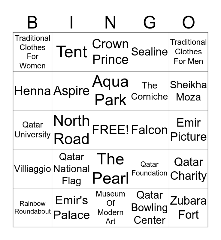 This bingo card has a free space and 24 words: Qatar National Flag, Emir's Palace, Aqua Park, Rainbow Roundabout, Traditional Clothes For Men, Traditional Clothes For Women, Henna, Tent, Falcon, The Pearl, The Corniche, Qatar University, Qatar Foundation, Qatar Charity, Aspire, Qatar Bowling Center, Emir Picture, Crown Prince, Sheikha Moza, North Road, Zubara Fort, Villiaggio, Sealine and Museum Of Modern Art.