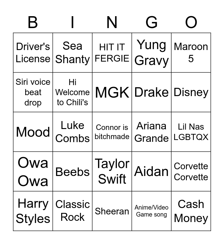 This bingo card has a free space and 34 words: Adele/Lourde, Anime/Video Game song, Not English, Kanye, Owa Owa, Hi Welcome to Chili's, Maroon 5, Harry Styles, Sea Shanty, Gospel, MGK, HIT IT FERGIE, Nickelodeon, Sheeesh!, Ariana Grande, Disney, Classic Rock, Mood, Beebs, Aidan, Taylor Swift, 2F OG Song, Driver's License, Lil Nas LGBTQX, Sheeran, Cash Money, Yung Gravy, Mac Miller, Drake, Siri voice beat drop, 90's boys band, Luke Combs, Corvette Corvette and Cardi/Nicki.