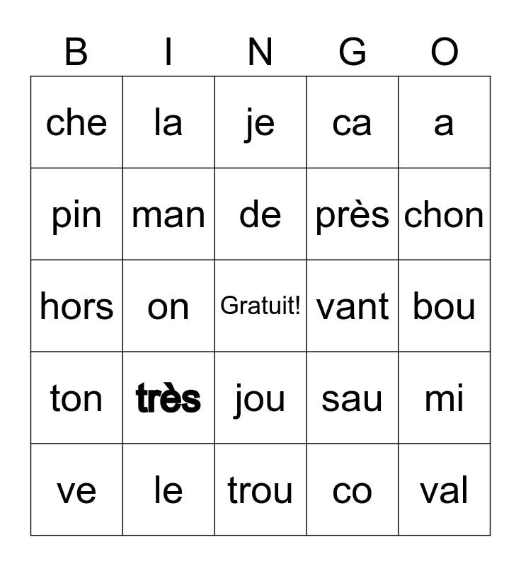 This bingo card has a free space and 24 words: très, le, de, ve, a, che, pin, la, vant, jou, près, hors, sau, mi, man, co, bou, je, chon, on, val, ton, ca and trou.