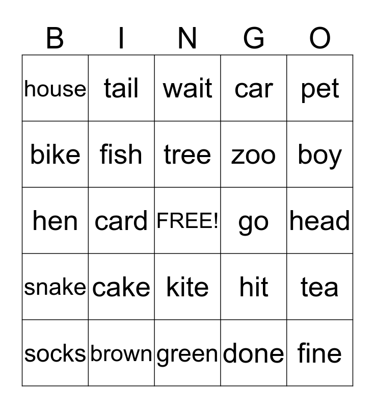 This bingo card has a free space and 24 words: cake, brown, tree, socks, pet, house, bike, tail, go, kite, zoo, hen, hit, tea, fish, done, head, wait, boy, card, fine, snake, car and green.