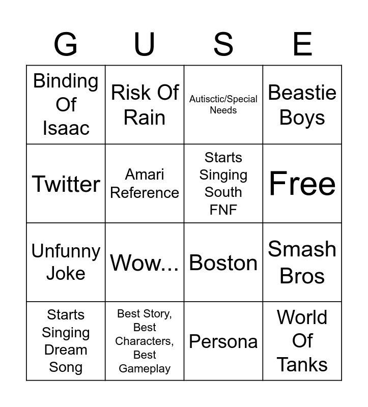 This bingo card has 17 words: Persona, Starts Singing Dream Song, Autisctic/Special Needs, Binding Of Isaac, Wow..., Beastie Boys, Smash Bros, Starts Singing South FNF, Free, Amari Reference, Best Story, Best Characters, Best Gameplay, Boston, Twitter, Risk Of Rain, Unfunny Joke, Hot Take and World Of Tanks.