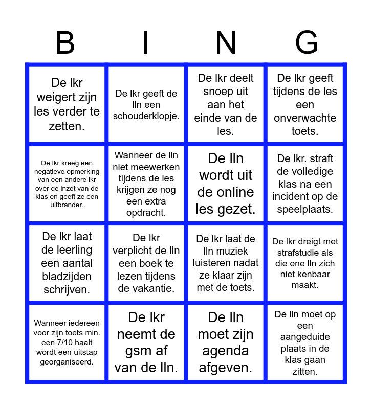 This bingo card has 21 words: De lkr neemt de gsm af van de lln., De lkr zet de lln uit de klas., De lkr geeft de lln een schouderklopje., De lln krijgt een pluspunt op zijn toets., De lln moet zijn agenda afgeven., De lln wordt uit de online les gezet., De lkr weigert zijn les verder te zetten., De lkr deelt snoep uit aan het einde van de les., De lkr laat de lln muziek luisteren nadat ze klaar zijn met de toets., De lkr. straft de volledige klas na een incident op de speelplaats., De lkr laat de leerling een aantal bladzijden schrijven., De lkr geeft tijdens de les een onverwachte toets., De lln moet op een aangeduide plaats in de klas gaan zitten., De lkr beloofd om de les 10 min. vroeger te stoppen als de lln goed meewerken., Wanneer de lln niet meewerken tijdens de les krijgen ze nog een extra opdracht., De lkr geeft de klas een compliment na een project., Wanneer iedereen voor zijn toets min. een 7/10 haalt wordt een uitstap georganiseerd., De lkr verplicht de lln een boek te lezen tijdens de vakantie., De lkr kreeg een negatieve opmerking van een andere lkr over de inzet van de klas en geeft ze een uitbrander., De lkr dreigt met strafstudie als die ene lln zich niet kenbaar maakt. and Een lln die stoort krijgt geen verwittiging maar moet onmiddellijk naar de directie..