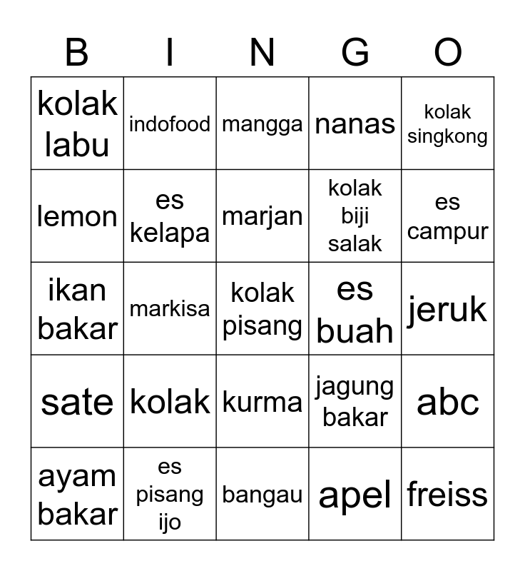 This bingo card has a free space and 24 words: ayam bakar, kolak, marjan, apel, kolak singkong, kolak labu, indofood, mangga, es buah, jeruk, ikan bakar, es kelapa, jagung bakar, abc, lemon, es pisang ijo, bangau, nanas, es campur, sate, markisa, kurma, kolak biji salak and freiss.