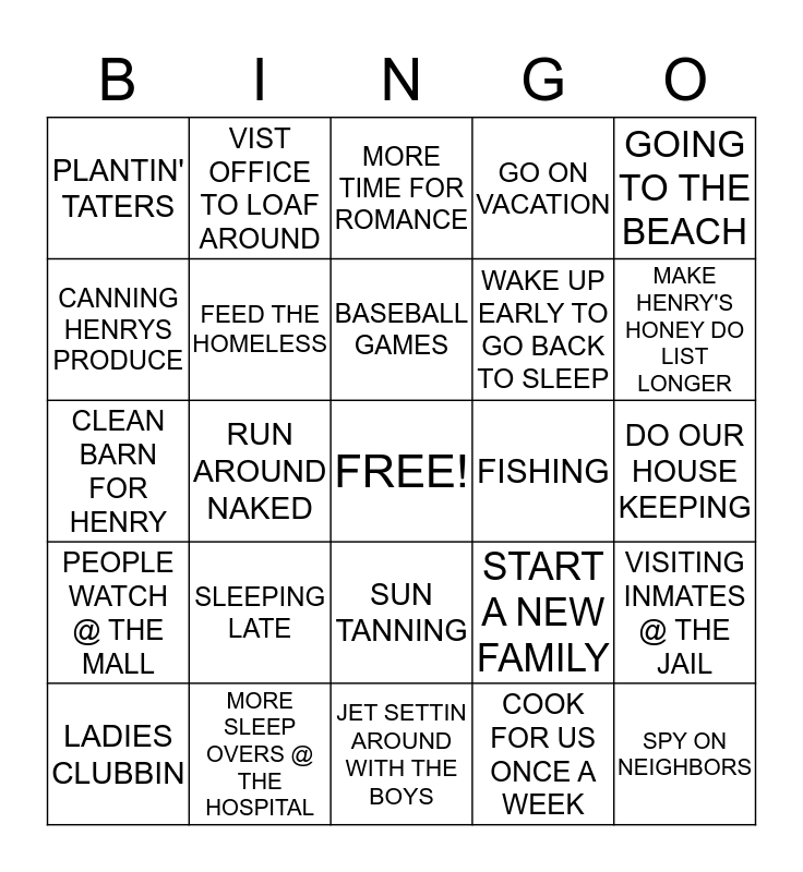 This bingo card has a free space and 24 words: SLEEPING LATE, MORE SLEEP OVERS @ THE HOSPITAL, BASEBALL GAMES, LADIES CLUBBIN, GOING TO THE BEACH, PLANTIN' TATERS, CANNING HENRYS PRODUCE, VIST OFFICE TO LOAF AROUND, FISHING, SUN TANNING, WAKE UP EARLY TO GO BACK TO SLEEP, CLEAN BARN FOR HENRY, START A NEW FAMILY, VISITING INMATES @ THE JAIL, FEED THE HOMELESS, COOK FOR US ONCE A WEEK, DO OUR HOUSE KEEPING, MORE TIME FOR ROMANCE, MAKE HENRY'S HONEY DO LIST LONGER, RUN AROUND NAKED, SPY ON NEIGHBORS, PEOPLE WATCH @ THE MALL, GO ON VACATION and JET SETTIN AROUND WITH THE BOYS.