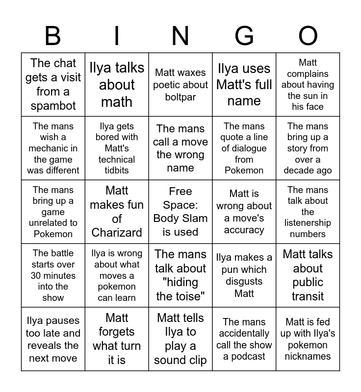 This bingo card has a free space and 29 words: Ilya pauses too late and reveals the next move, Matt drinks a beer, Matt makes fun of Charizard, The mans argue over what Eevee is, The chat gets a visit from a spambot, Matt waxes poetic about boltpar, Ilya gets bored with Matt's technical tidbits, Ilya is wrong about what moves a pokemon can learn, Matt is wrong about a move's accuracy, Matt forgets what turn it is, The mans talk about the listenership numbers, Matt is fed up with Ilya's pokemon nicknames, Matt tells Ilya to play a sound clip, The mans accidentally call the show a podcast, The mans bring up a story from over a decade ago, The mans reference a Netbattle quote, The mans talk about "hiding the toise", The battle starts over 30 minutes into the show, Matt complains about having the sun in his face, The mans bring up a game unrelated to Pokemon, Ilya makes a pun which disgusts Matt, Ilya makes a pun which amuses Matt, The mans quote a line of dialogue from Pokemon, The mans wish a mechanic in the game was different, Ilya uses Matt's full name, Ilya talks about math, Matt talks about public transit, The mans call a move the wrong name and Ilya fucks up the intro.