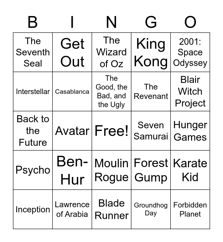 This bingo card has a free space and 26 words: Moulin Rogue, Groundhog Day, The Good, the Bad, and the Ugly, Lawrence of Arabia, 2001: Space Odyssey, The Seventh Seal, Interstellar, Get Out, Hunger Games, Forest Gump, The Revenant, Back to the Future, Karate Kid, Inception, Avatar, Batman, King Kong, Psycho, The Wizard of Oz, Forbidden Planet, Blair Witch Project, Blade Runner, Seven Samurai, Ben-Hur, Casablanca and The Day the Earth Stood Still.