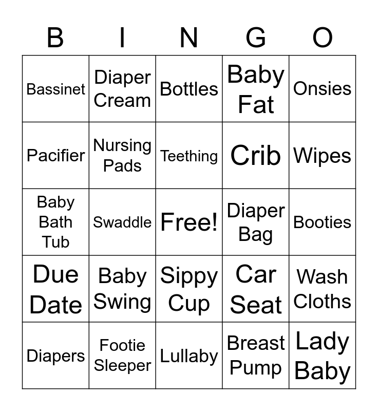 This bingo card has a free space and 24 words: Baby Swing, Footie Sleeper, Teething, Diapers, Onsies, Bassinet, Pacifier, Diaper Cream, Diaper Bag, Sippy Cup, Crib, Baby Bath Tub, Car Seat, Wash Cloths, Nursing Pads, Breast Pump, Booties, Bottles, Wipes, Swaddle, Lady Baby, Due Date, Baby Fat and Lullaby.