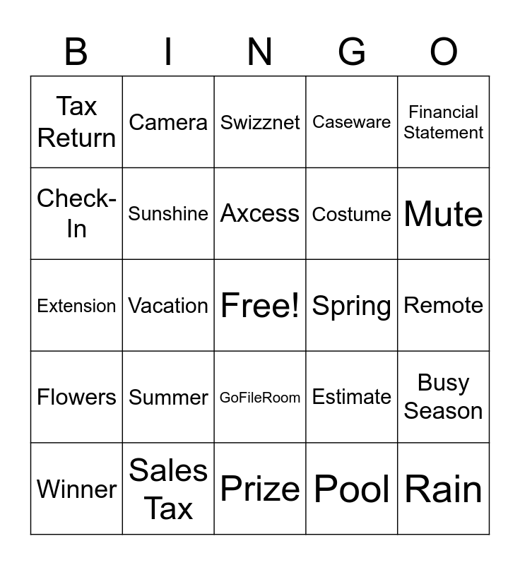 This bingo card has a free space and 29 words: Winner, Weather, Vacation, Teams, Tax Return, Swizznet, Sunshine, Summer, Spring, Sales Tax, Remote, Rain, Prize, Pool, Mute, Lunch, GoFileRoom, Flowers, Financial Statement, Extension, Estimate, Deadline, Costume, Check-In, Caseware, Camera, Busy Season, Axcess and ACS.