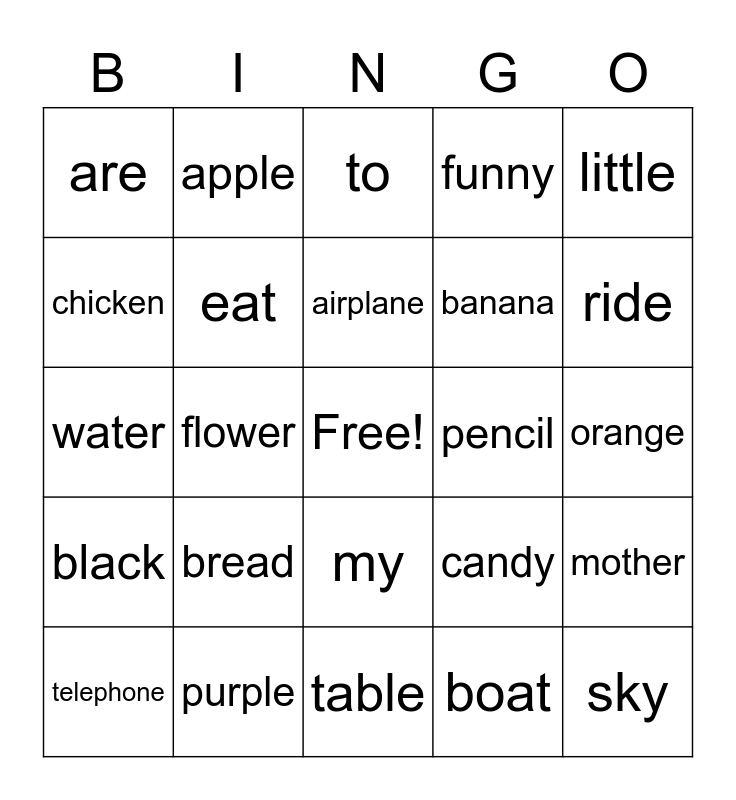 This bingo card has a free space and 24 words: bread, purple, airplane, telephone, little, are, chicken, apple, pencil, my, banana, water, candy, mother, eat, boat, orange, to, ride, flower, sky, black, funny and table.