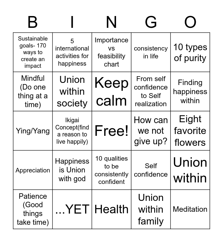 This bingo card has a free space and 24 words: Happiness is Union with god, ...YET, Keep calm, Patience (Good things take time), 10 types of purity, Sustainable goals- 170 ways to create an impact, Mindful (Do one thing at a time), 5 international activities for happiness, How can we not give up?, 10 qualities to be consistently confident, From self confidence to Self realization, Ying/Yang, Self confidence, Union within, Union within society, Union within family, Eight favorite flowers, Importance vs feasibility chart, Finding happiness within, Ikigai Concept(find a reason to live happily), Meditation, Appreciation, consistency in life and Health.