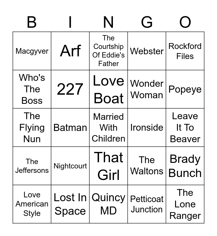 This bingo card has a free space and 29 words: Love American Style, Barnaby Jones, Batman, Police Woman, Macgyver, The Courtship Of Eddie's Father, 227, Nightcourt, Ironside, Lost In Space, Leave It To Beaver, The Lone Ranger, Quincy MD, Petticoat Junction, Popeye, My Three Sons, That Girl, The Jeffersons, Rockford Files, The Flying Nun, The Waltons, Scooby Doo, Wonder Woman, Who's The Boss, Webster, Arf, Brady Bunch, Love Boat and Married with Children.