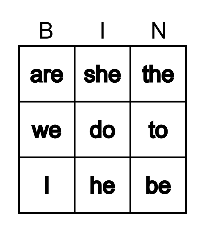 This bingo card has a free space and 11 words: was, all, to, I, the, are, he, me, we, she and be.