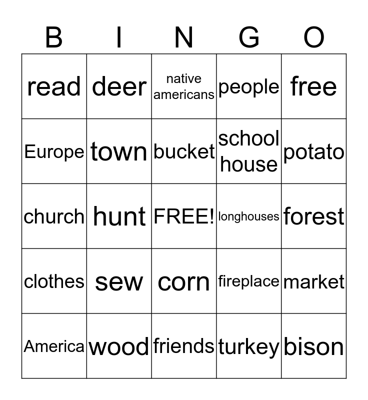 This bingo card has a free space and 24 words: sew, wood, bucket, America, free, read, Europe, deer, longhouses, corn, school house, church, fireplace, market, town, turkey, forest, native americans, potato, hunt, bison, clothes, people and friends.
