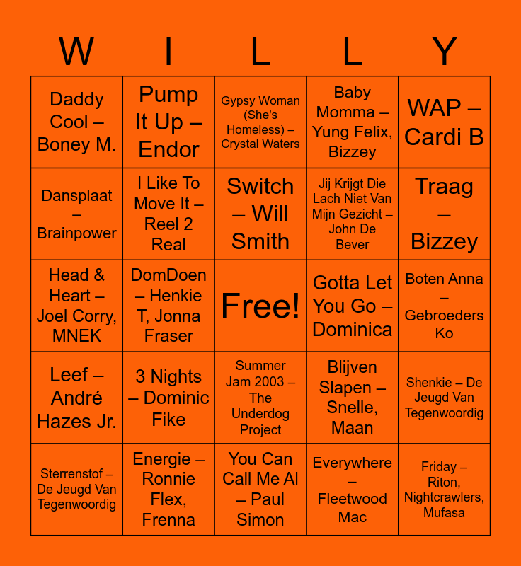 This bingo card has a free space and 99 words: The Weekend – Michael Gray, Music Sounds Better With You – Stardust, Lola's Theme – The Shapeshifters, Gypsy Woman (She's Homeless) – Crystal Waters, You Don't Know Me – Armand Van Helden, Duane Harden, Destination Calabria – Alex Gaudino, Around the World – Daft Punk, Boogie Wonderland – Earth, Wind & Fire, The Emotions, Stayin' Alive – Bee Gees, Stupidisco – Junior Jack, Mas Que Nada – Sérgio Mendes, Black Eyed Peas, Still D.R.E. – Dr. Dre, Snoop Dogg, Call on Me – Eric Prydz, Summer Jam 2003 – The Underdog Project, Boogie 2Nite – Booty Luv, Daddy Cool – Boney M., Pump It Up – Endor, It's Like That – Run–D.M.C., Meet Her At The Loveparade – Da Hool, Crying at the Discoteque – Alcazar, Dragostea Din Tei – O-Zone, Pump Up The Jam – Technotronic, Gonna Make You Sweat – C & C Music Factory, I Got You (I Feel Good) – James Brown, Blue (Da Ba Dee) - Eiffel 65, Gabry Ponte, Shenkie – De Jeugd Van Tegenwoordig, Switch – Will Smith, Narcotic - Radio Edit – Liquido, Butterfly – Crazy Town, You Sexy Thing – Hot Chocolate, You Can Call Me Al – Paul Simon, Everywhere – Fleetwood Mac, Better Off Alone – Alice Deejay, Get Lucky – Daft Punk, Pharrell Williams, Nile Rodgers, DomDoen – Henkie T, Jonna Fraser, Head & Heart – Joel Corry, MNEK, You Make Me Feel (Mighty Real) – Sylvester, Harder, Better, Faster, Stronger – Daft Punk, Bassline Junkie – Dizzee Rascal, 3 Nights – Dominic Fike, Jamming – Bob Marley & The Wailers, Traag – Bizzey, Baby Momma – Yung Felix, Bizzey, Energie – Ronnie Flex, Frenna, DRUP – Bizzey, Fuifje – DoeMaarDave, LEKKER MET DE MEIDEN – MEROL, Watskeburt?! – De Jeugd Van Tegenwoordig, Tout Est Bon – Boef, Numidia, Barry Hayze – Donnie, Willie Wartaal, White Girl$ – Abel de Jong, Mr. Polska, Friday – Riton, Nightcrawlers, Mufasa, Blijven Slapen – Snelle, Maan, Peaches – Justin Bieber, Rasputin – Majestic, Boney M., Frans Duits – Donnie, Frans Duijts, In De Schuur – Snelle, Ronnie Flex, 501 – Bilal Wahib, Ronnie Flex, Snollebolleke – Snollebollekes, Mamma Mia – ABBA, Get Spanish – De Jeugd Van Tegenwoordig, Señorita – Justin Timberlake, Drop It Like It's Hot – Snoop Dogg, Dancing Queen – ABBA, Man's Not Hot – Big Shaq, WAP – Cardi B, HOLIDAY – Lil Nas X, Candy Shop – 50 Cent, Olivia, Ik Hou D'r Zo Van - Gerard Joling, Leef – André Hazes Jr., Heb Je Even Voor Mij – Frans Bauer, Jij Krijgt Die Lach Niet Van Mijn Gezicht – John De Bever, Dansplaat – Brainpower, Rock This Party - Everybody Dance Now – Bob Sinclar, Rampeneren – The Partysquad, Toppertje! Guillermo, Tropical Danny, I Like To Move It – Reel 2 Real, Free from Desire – Aleix Sin, Tijdmachine – Dio, Sef, Drop It – Scoop, Gotta Let You Go – Dominica, 22 Baco – Lange Frans, Baas B, Schudden – Def Rhymz, Have You Ever Been Mellow - Party Animals, Dom, Lomp & Famous – The Opposites, Ain't No Party - Like An Alcoholic Party – DJ Kicken, Mundian to Bach Ke – Panjabi MC, Que Si, Que No – Jody Bernal, Boten Anna – Gebroeders Ko, Sterrenstof – De Jeugd Van Tegenwoordig, Broodje Bakpao – The Opposites, Ik Ga Hard – The Partysquad, Hava Naquila – Party Animals, Casanova – Ultimate Kaos, No Diggity – Blackstreet, Dr. Dre, California Love – 2Pac, Dr. Dre, Xxplosive – Dr. Dre, Turn Me On – Kevin Lyttle and No Games – Serani.