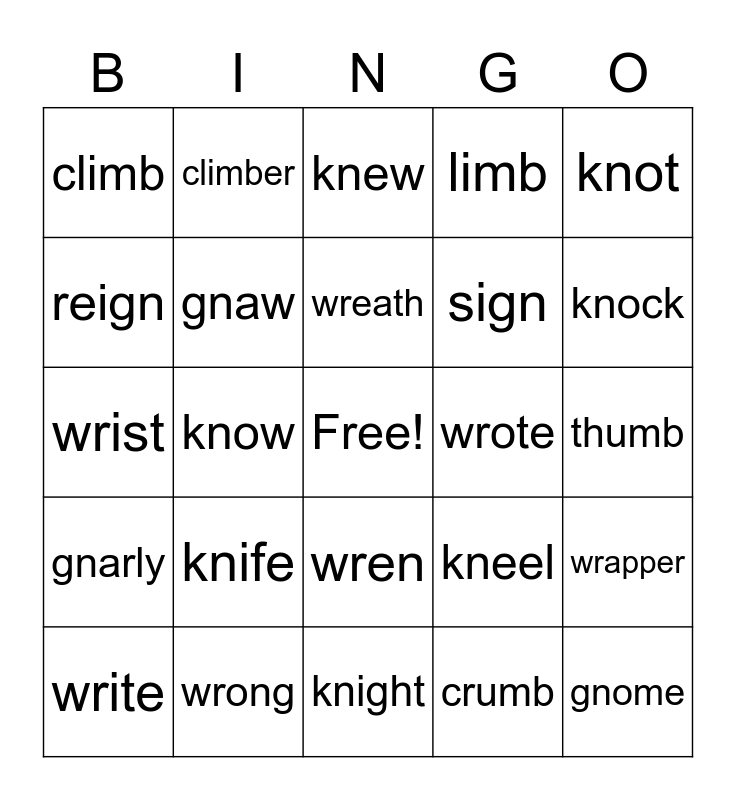 This bingo card has a free space and 29 words: write, lamb, know, gnat, climb, knew, gnaw, knife, wrote, wrong, thumb, gnome, knight, crumb, knock, wrap, wren, gnarly, knot, wrist, kneel, knit, sign, reign, limb, climber, wrapper, wreath and wrestle.