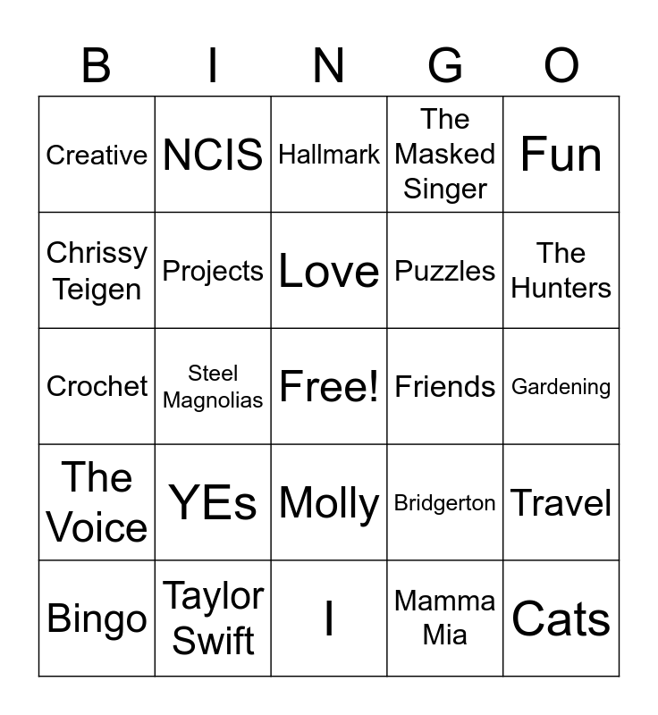 This bingo card has a free space and 25 words: YEs, I, Love, Bingo, Fun, Creative, Chrissy Teigen, NCIS, Friends, Molly, Puzzles, Crochet, Bridgerton, Travel, Projects, Hamilton, Gardening, Hallmark, The Hunters, Steel Magnolias, Cats, Taylor Swift, The Voice, The Masked Singer and Mamma Mia.